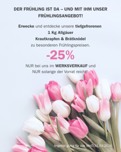 Das Sortiment umfasst eine Vielzahl von Spezialitäten, darunter handwerklich hergestellte Allgäuer Pfannengerichte und Beilagen wie Krautkrapfen, Krautschupfnudeln, Kässpätzle und traditionelle Suppeneinlagen wie Brätknödel, Brätspätzle, Leberknödel, etc.